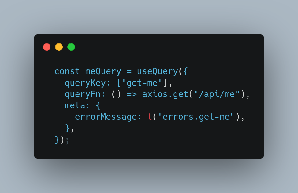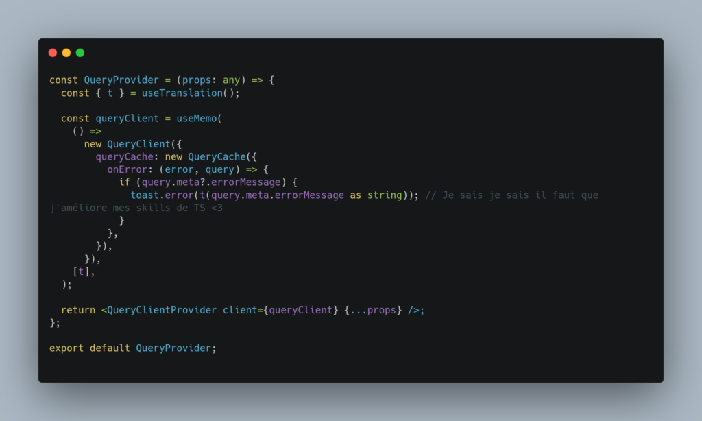 A présent, dès qu’une de mes query est en erreur, j’ai un petit toast d’erreur qui s’affiche, a la condition que j’ai rempli le champ meta de ma query, qui sert a ajouter des informations de contexte dans le cache de TanstackQuery. Pour ma part je met un message avec ma clé de traduction i18next.