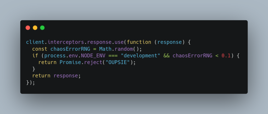 Puis j’ai commencé a mettre en place un petit intercepteur Axios pour faire du chaos engineering, et vérifier que je gérais bien les erreurs (spoiler bis: pas du tout)